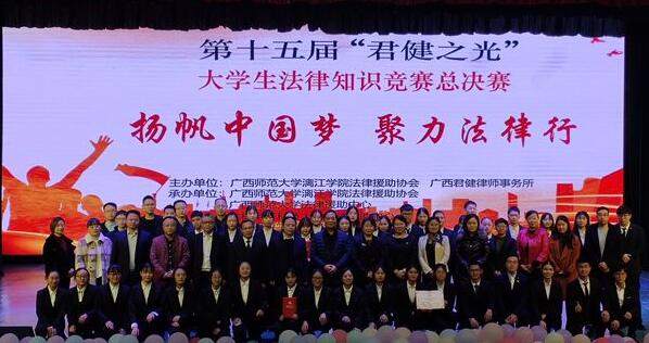 12月3日,由我所资助冠名以“扬帆中国梦,聚力法律行”为主题的第十五届“君健之光”大学生法律知识竞赛总决赛在广西师范大学漓江学院多功能报告厅正式开赛。 广西君健律师事务所主任黄丽娟、副主任熊茂玉、党支部书记黄如均、合伙人程进宝、蒋贤杰、艾丽红和律师黄里瑞、邹倩、卢自聪等应邀出席。桂林市人民检察院第二检察部甘桂明主任、广西师范大学法学院副院长陶斌智、桂林市律师行业党委宣传委员秦有荣律师也应邀出席此次活动,该校商贸与法律学院领导班子林驰、陈俊杰、陈建文、刘雪,法学教研室全体师生500余人参加了活动。