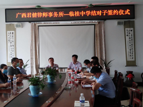 活动当天,临桂中学袁红波校长和李文荣书记、虞小燕副校长,我所合伙人暨党支部书记黄如均、合伙人暨党支部副书记赵孟安和组织委员卢自聪及刘满玉、秦兆成等五名律师参加了此次活动。 签订仪式会上,袁红波校长表示,对君健律师事务所作为本地优秀的律师事务所,愿意为学校的法律建设贡献力量表示热烈欢迎,希望律师团队为学校依法治校提供专业法律服务,双方在今后的工作中积极加强合作,共同为平安校园、法治校园的建设作出努力。 我所合伙人、党支部书记表示,临桂中学作为自治区重点中学,桂林知名的示范性高中,有着深厚的文化底蕴,为国家培养了诸多杰出人才,能为这样一所有着优秀传统文化的学校提供法律服务深感荣幸,在今后的工作中,将密切地与学校加强沟通与交流,为学校法律建设做出律师的社会责任与担当。