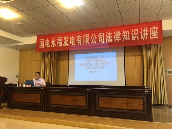 2020年7月7日,应国电永福发电有限公司邀请,为促进企业的复工复产工作,作为桂林市总工会法律服务律师团成员,广西君健律师事务所指派青年律师蒋贤杰、邹倩前往该公司开展法律知识讲座。