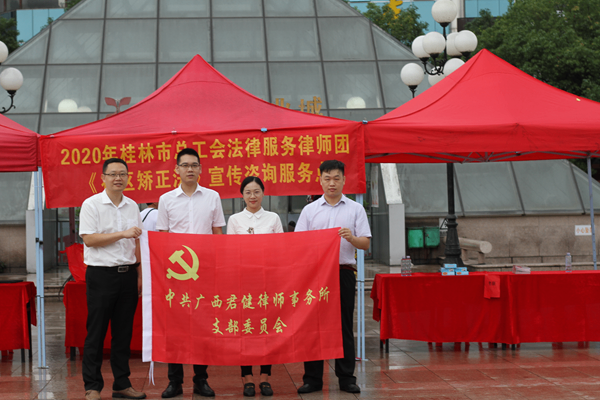 (6月8日,我所蒋贤杰、卢自聪律师及实习律师廖鑫凯、秦洁应邀参加了由桂林市社区矫正工作领导小组办公室在桂林市中心广场组织的《社区矫正法》宣传活动。)