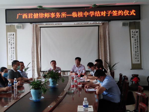 (5月30日,我所与临桂中学法律服务结对子签约仪式在临桂中学举行,指派以党支部黄如均书记、副书记赵孟安为领队的法律服务团,为该校提供法律咨询服务。)